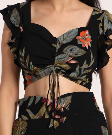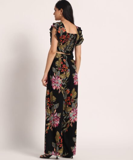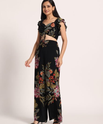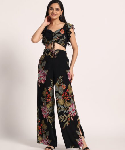 Floral Smocked Crop Top with Slit Pants – a breezy floral co-ord set featuring a ruched sweetheart neckline crop top 💖 and ankle-length side slit pants 🌿. Crafted from soft rayon crepe, this stylish and comfortable set is perfect for your everyday casual look. Comes with full lining and an effortlessly chic vibe. ✨